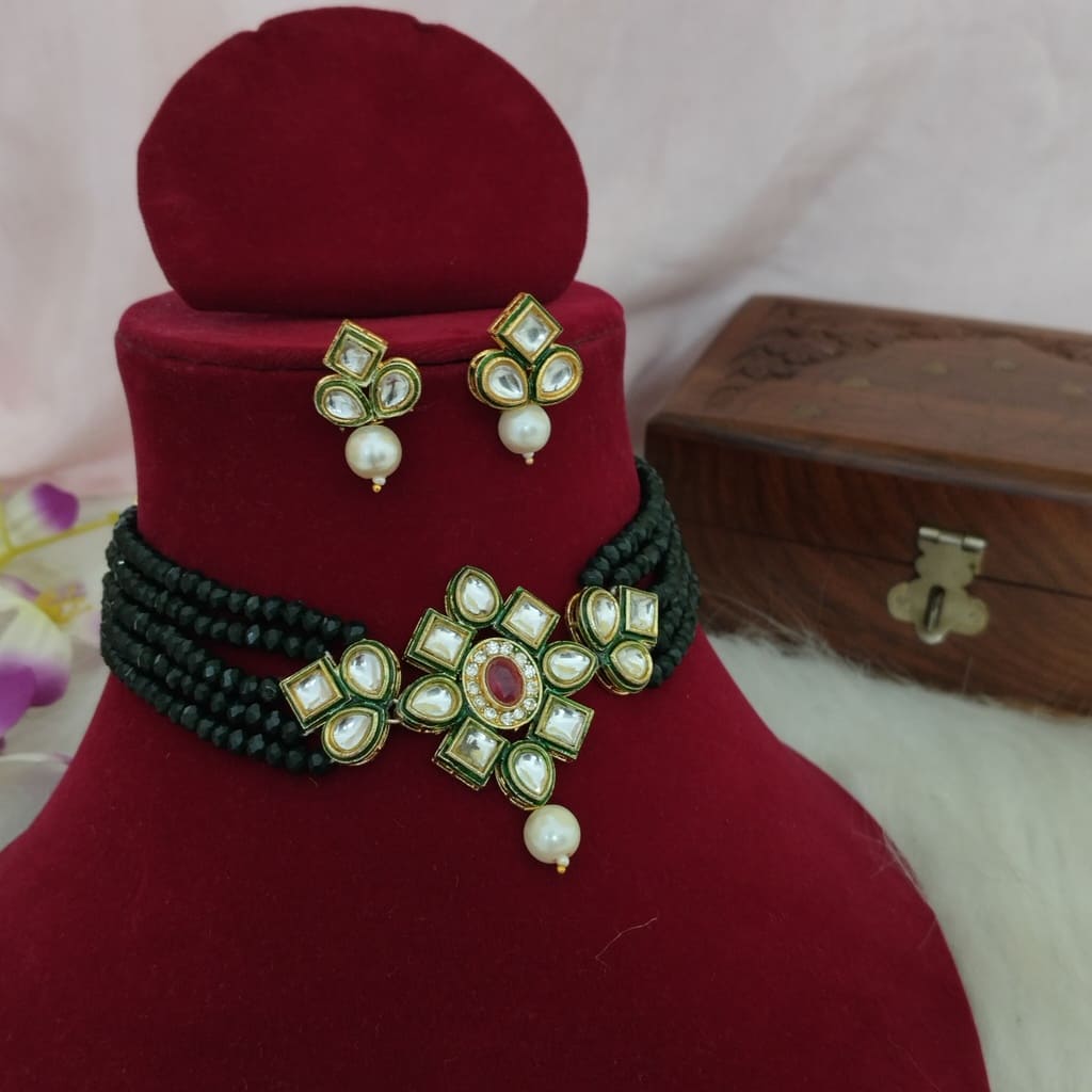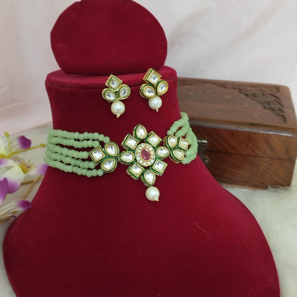 Elevate your ethnic charm with this elegant Mint Green Kundan Choker Necklace Set, crafted for women who love traditional jewelry with a modern twist. Adorned with premium kundan stones, a touch of pearl hangings, and multiple strands of mint green beads, this designer choker is perfect for weddings, festivals, or any ethnic celebration.