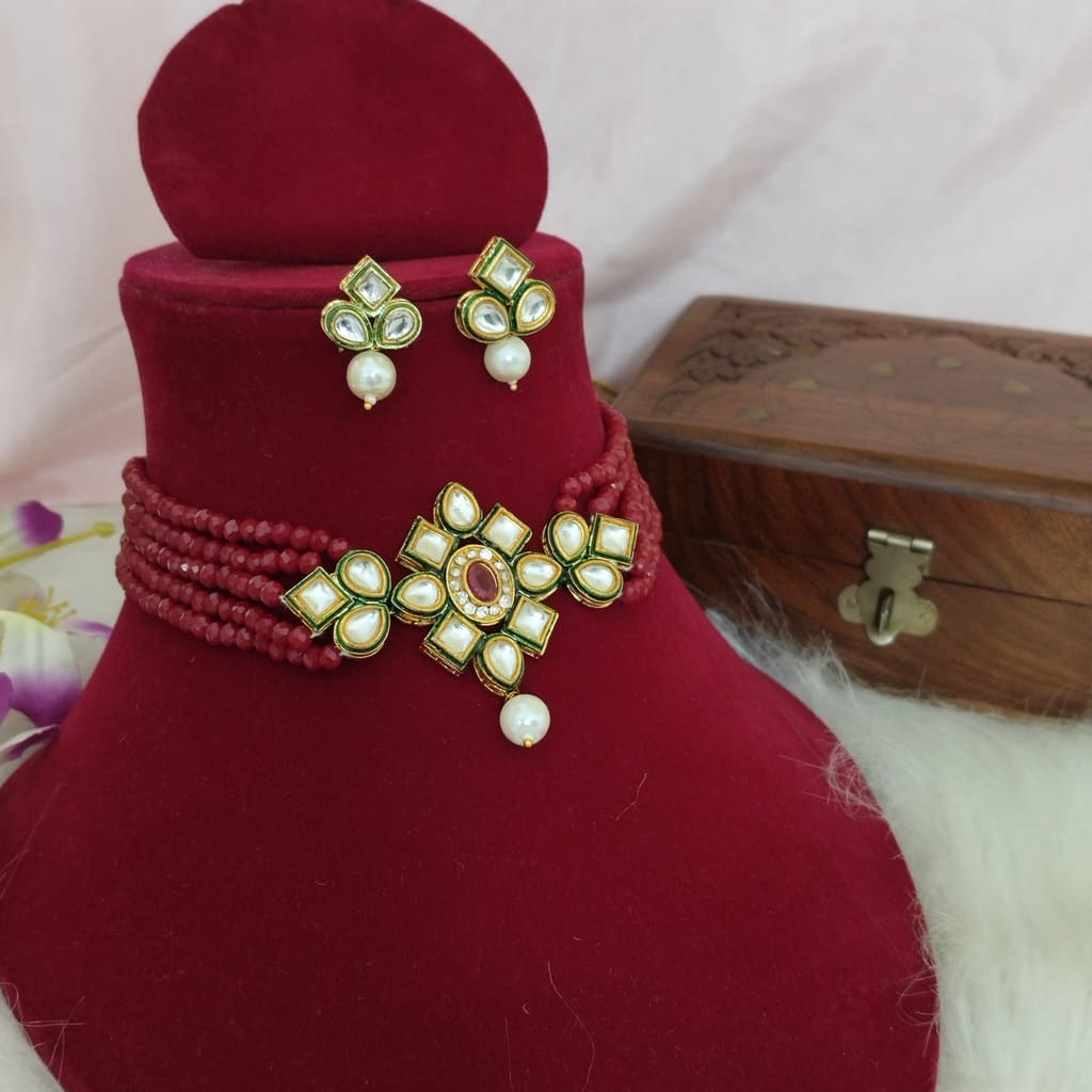 Whether you're a bride, bridesmaid, or wedding guest, this choker and earring set adds grace and richness to sarees, lehengas, and Anarkali suits. The intricate floral centerpiece with a hint of pink makes it stand out while maintaining timeless appeal.