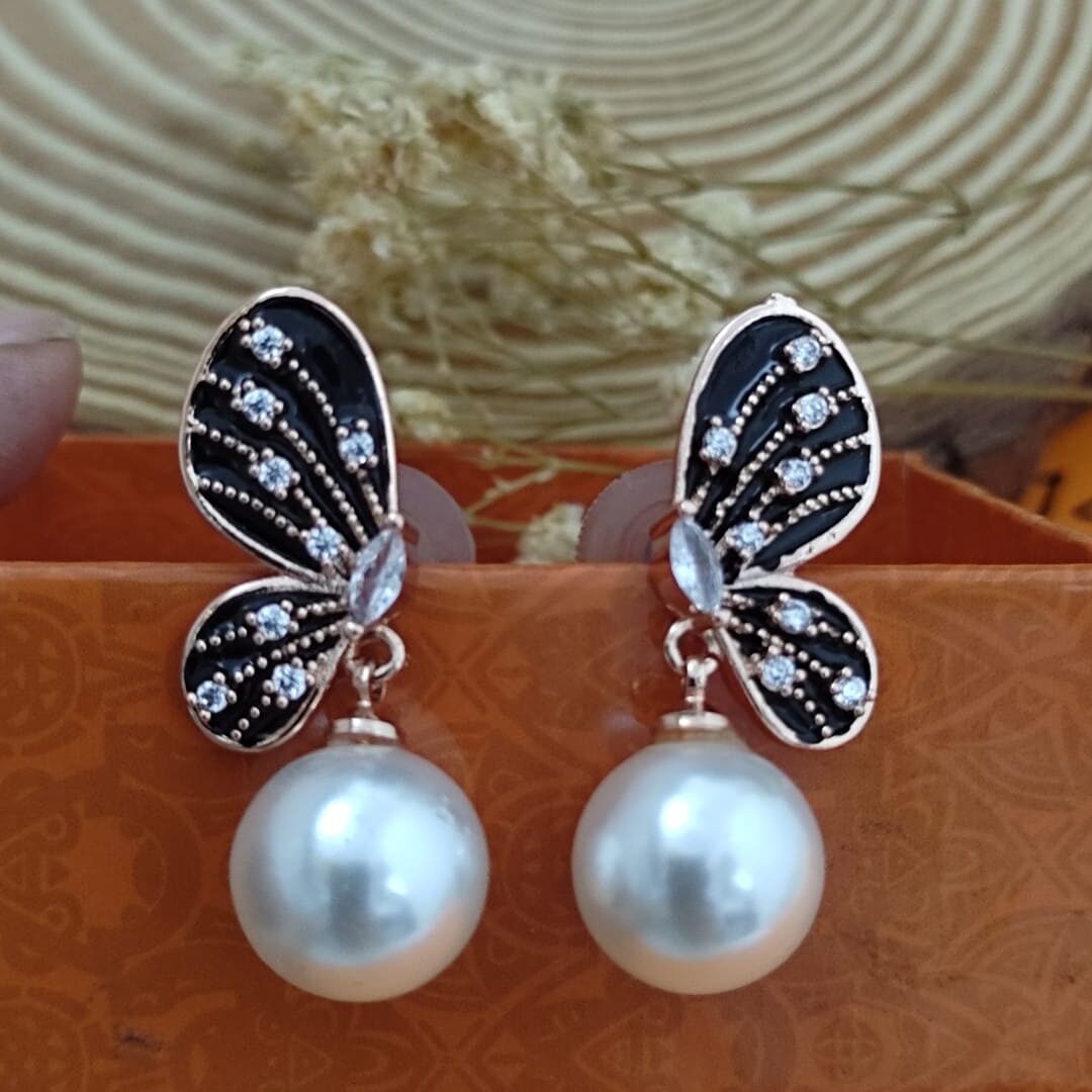 ✅ Design: Intricate black butterfly studs with elegant pearl drops
