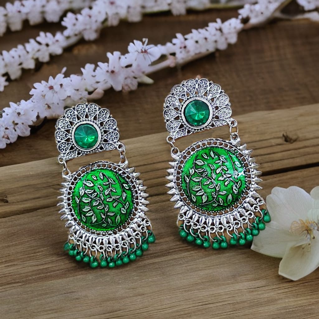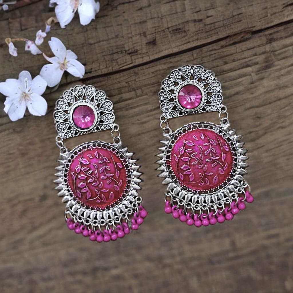 The lightweight dangler design ensures graceful movement, while the bold pink accents bring a fresh pop of color—perfect for pairing with ethnic outfits, festive wear, or fusion styles. Whether for a celebration or a casual day out, these oxidized Meenakari earrings offer timeless charm with a contemporary twist.