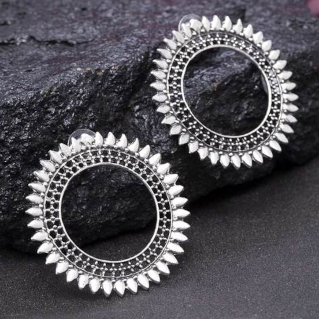 Perfect for cultural festivals, casual chic outfits, or standout everyday wear, these sun stud earrings embody both power and personality. The oxidized finish adds a vintage charm, while the oversized design provides a contemporary twist that’s perfect for fashion-forward women.